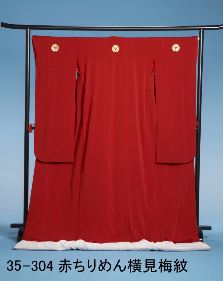 やわらかな赤のちりめんに、梅の紋がさりげなく輝く上品な一枚。