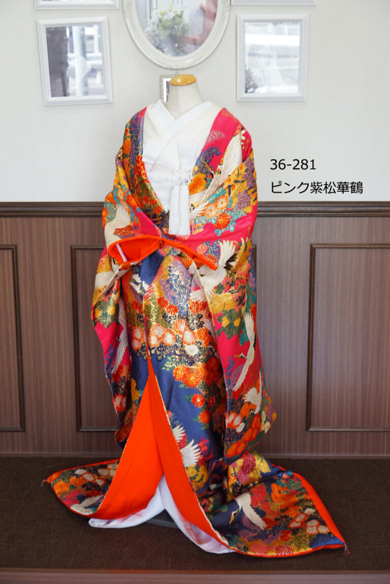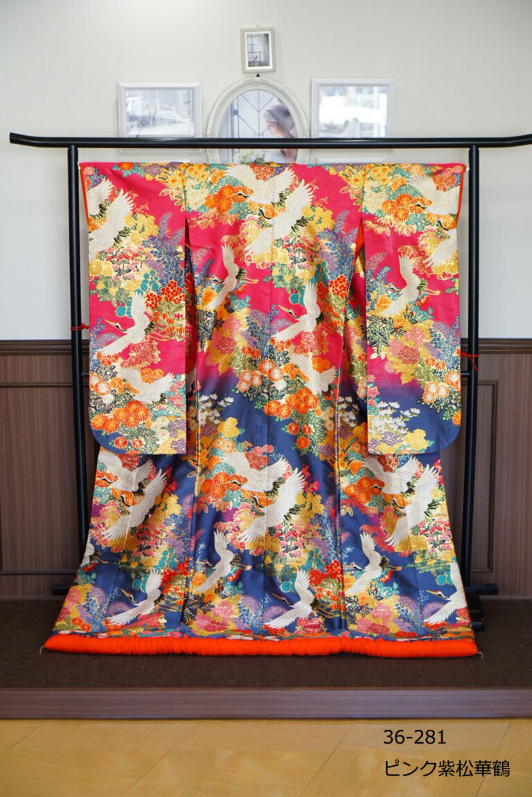 ピンクと紫が織りなす優美な色合いに、鶴と松の文様が映える華やかな打掛。