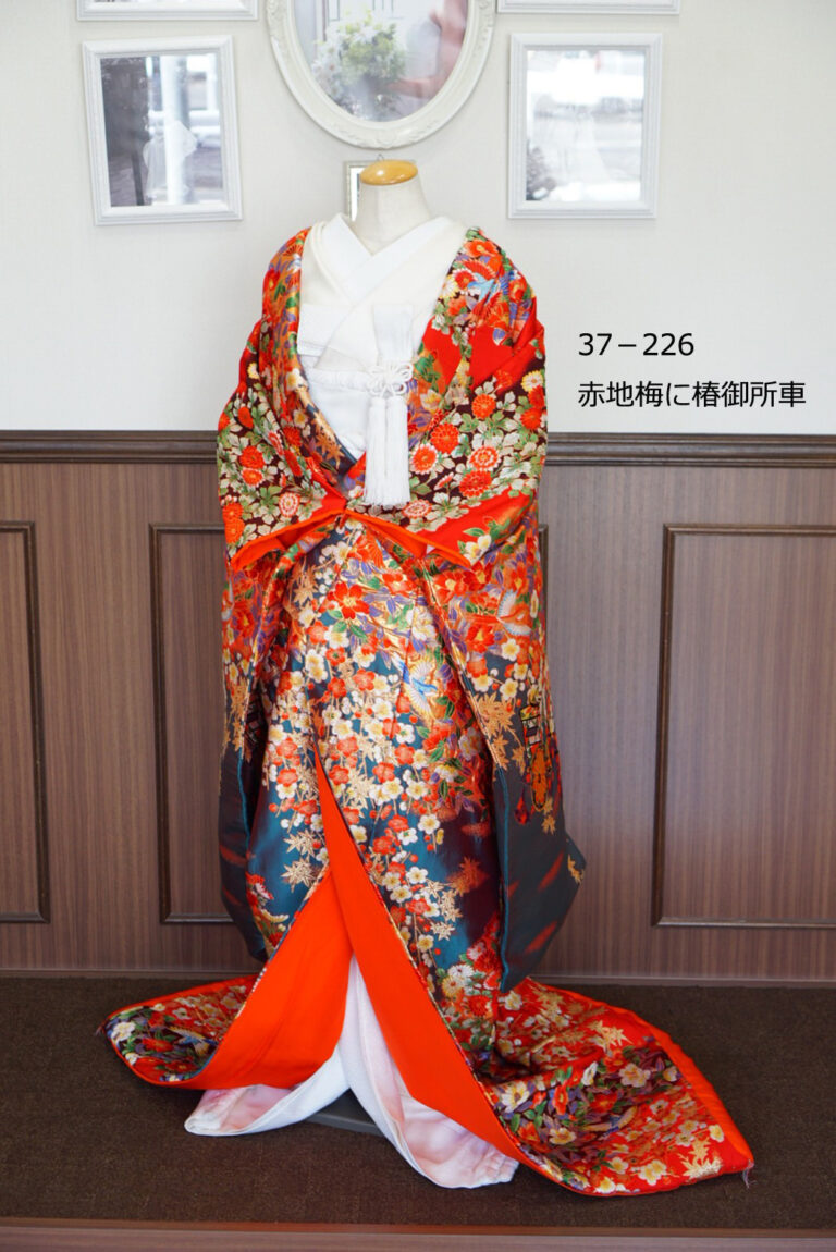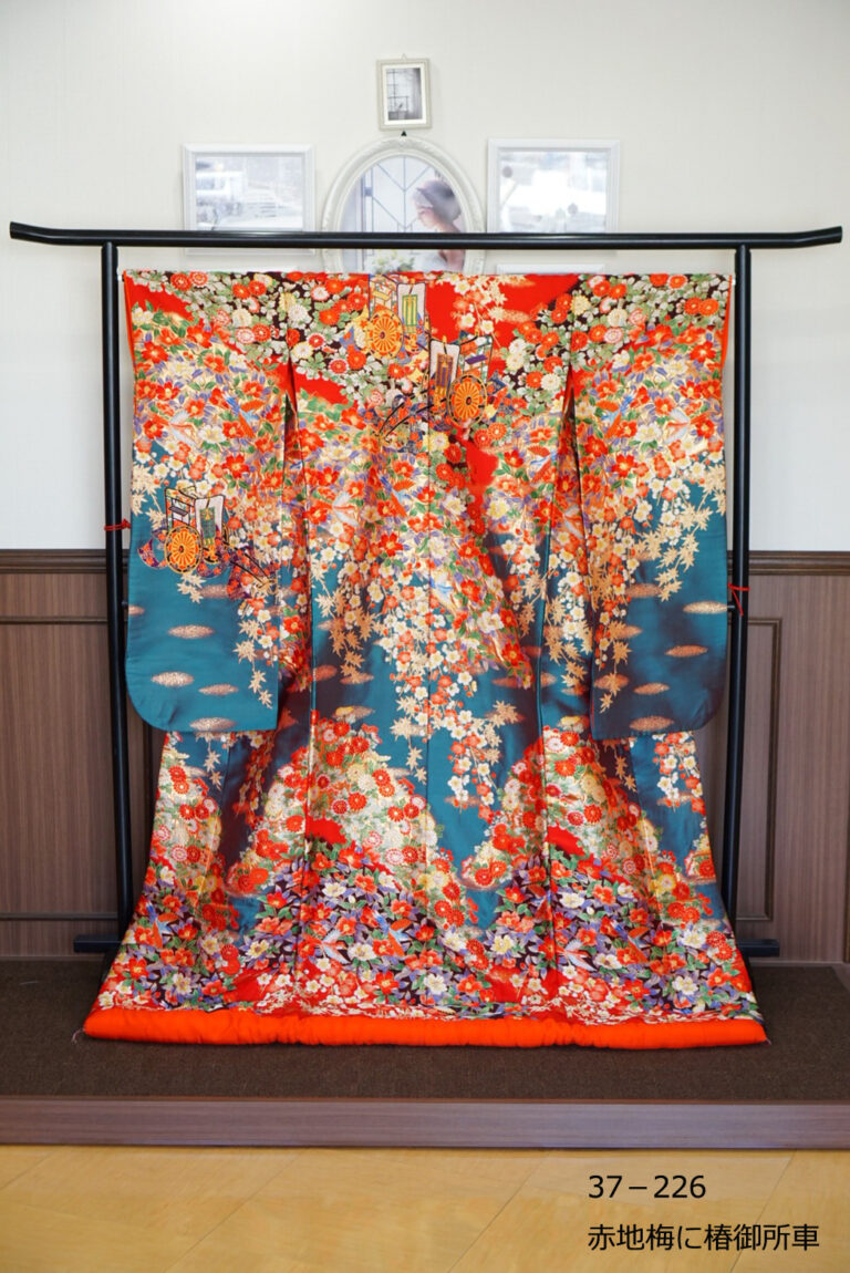 鮮やかな赤地に四季折々の花々や御所車が織り込まれた華やかで格調高い色打掛