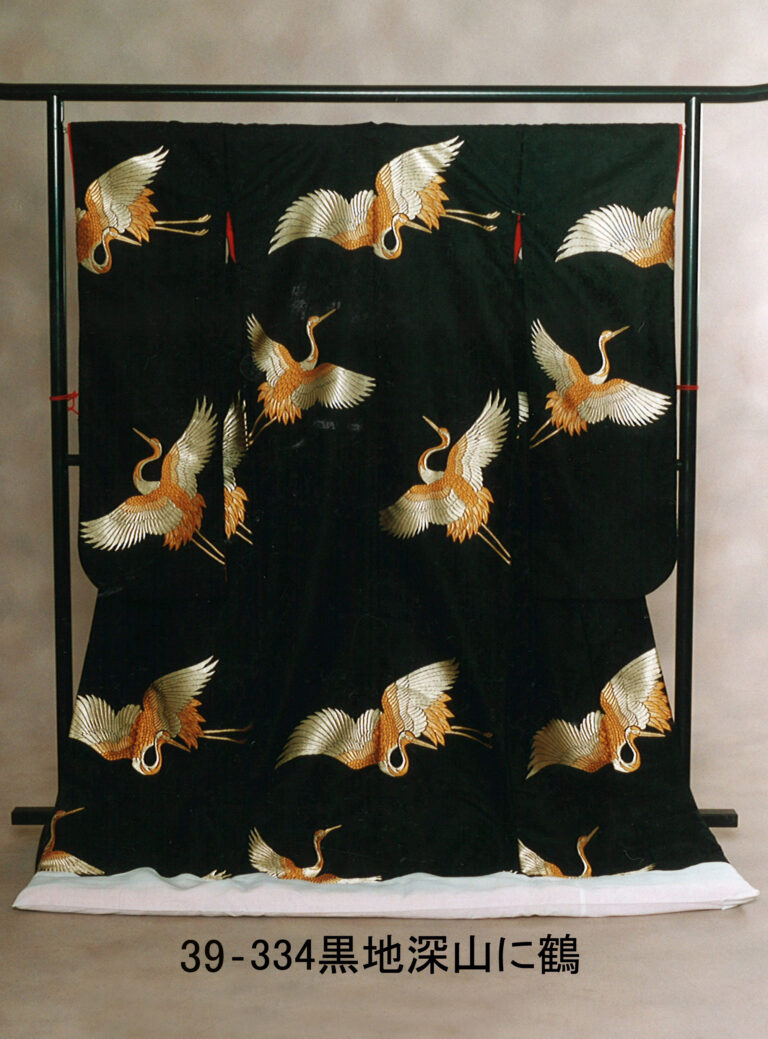 深みのある黒地に、金糸で優雅に舞う鶴が描かれた格調高い打掛。