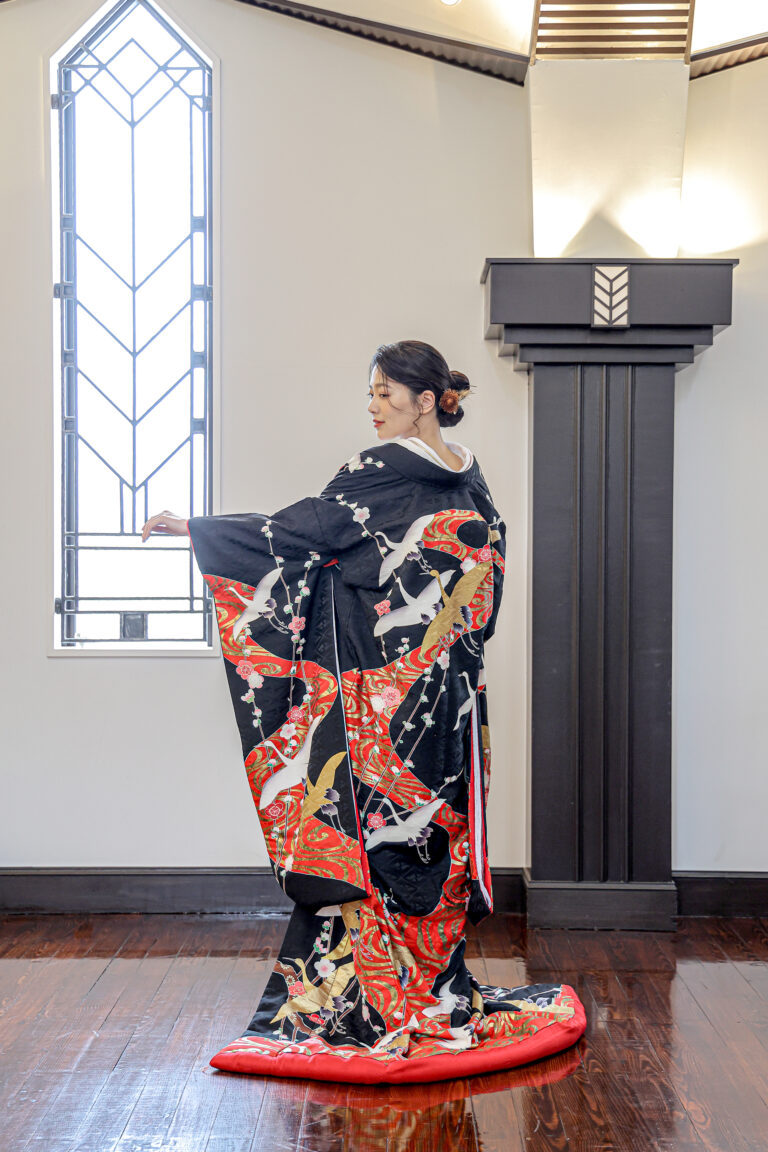 深い黒地に鮮やかな赤が映え豪華絢爛なデザインが花嫁の美しさを際立たせます。