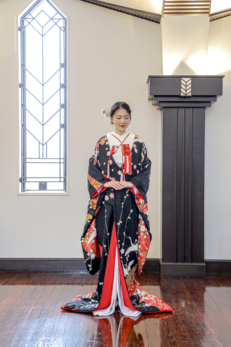 黒地に赤の色打掛は和婚の美しさを際立たせる逸品