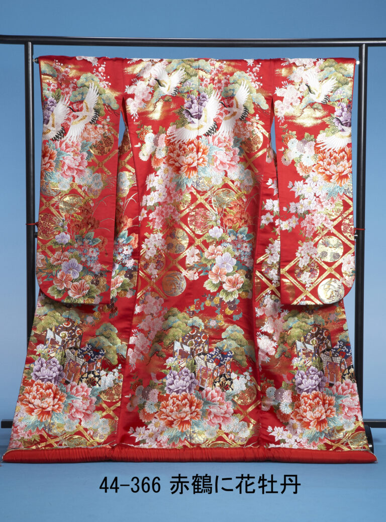 鮮やかな赤地に、白鶴と大輪の牡丹が咲き誇る華やかな一着。