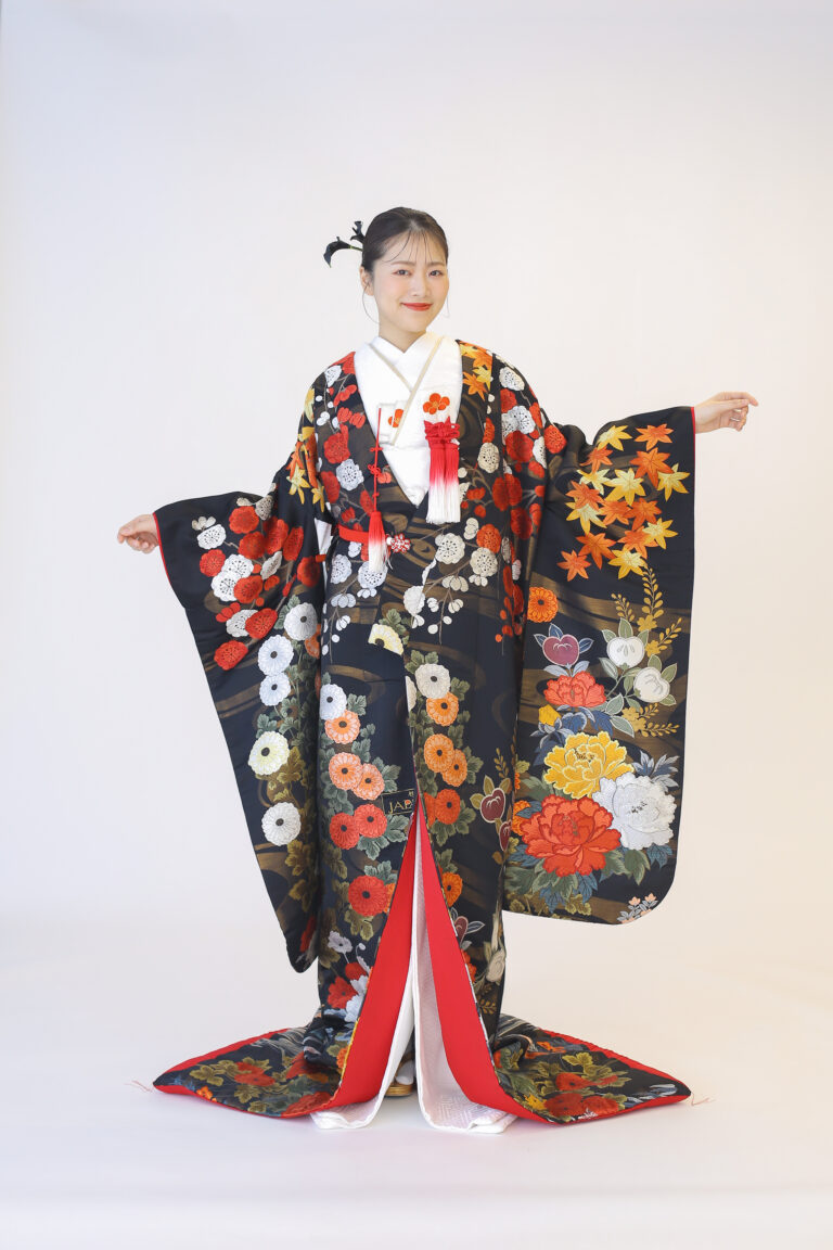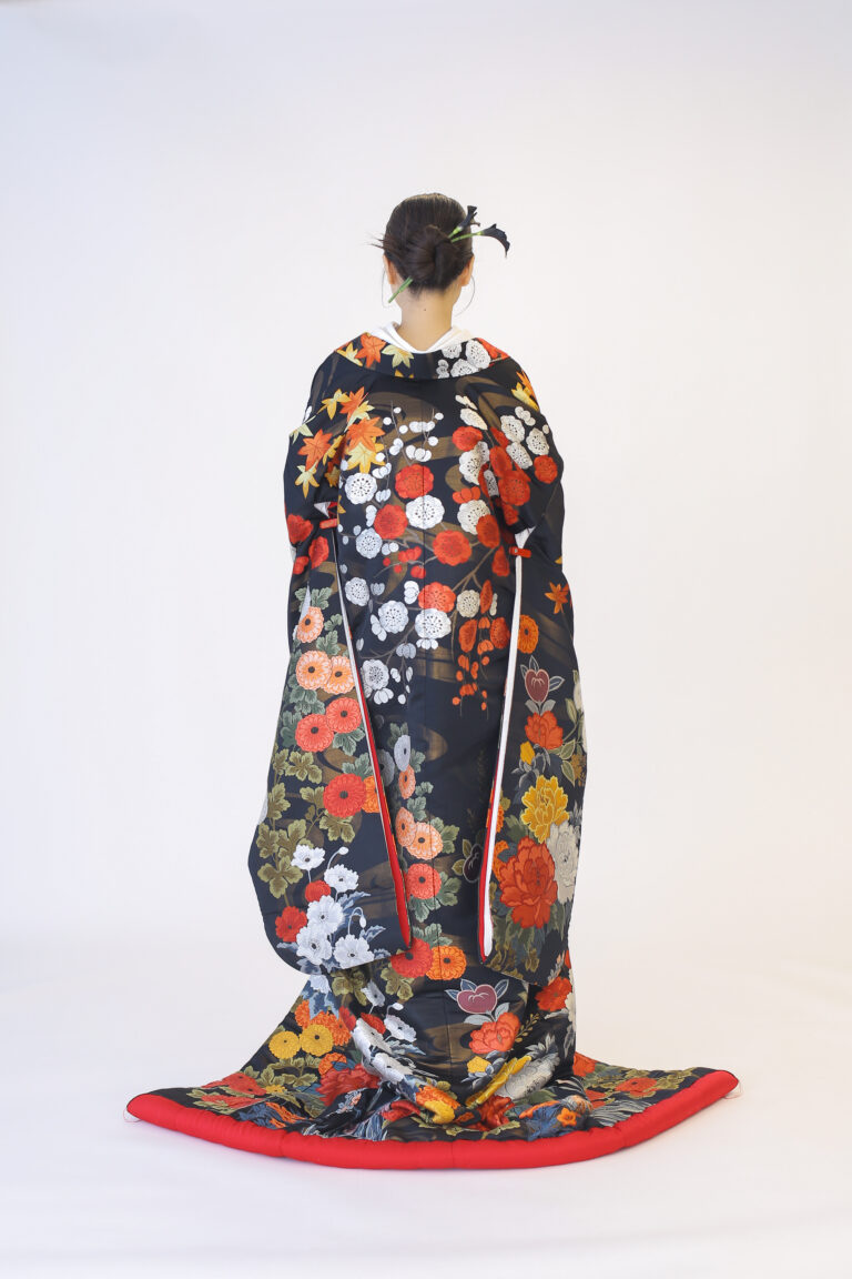 四季の花々を鮮やかな色遣いで織り上げた色打掛