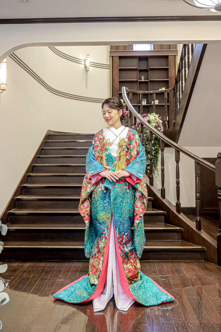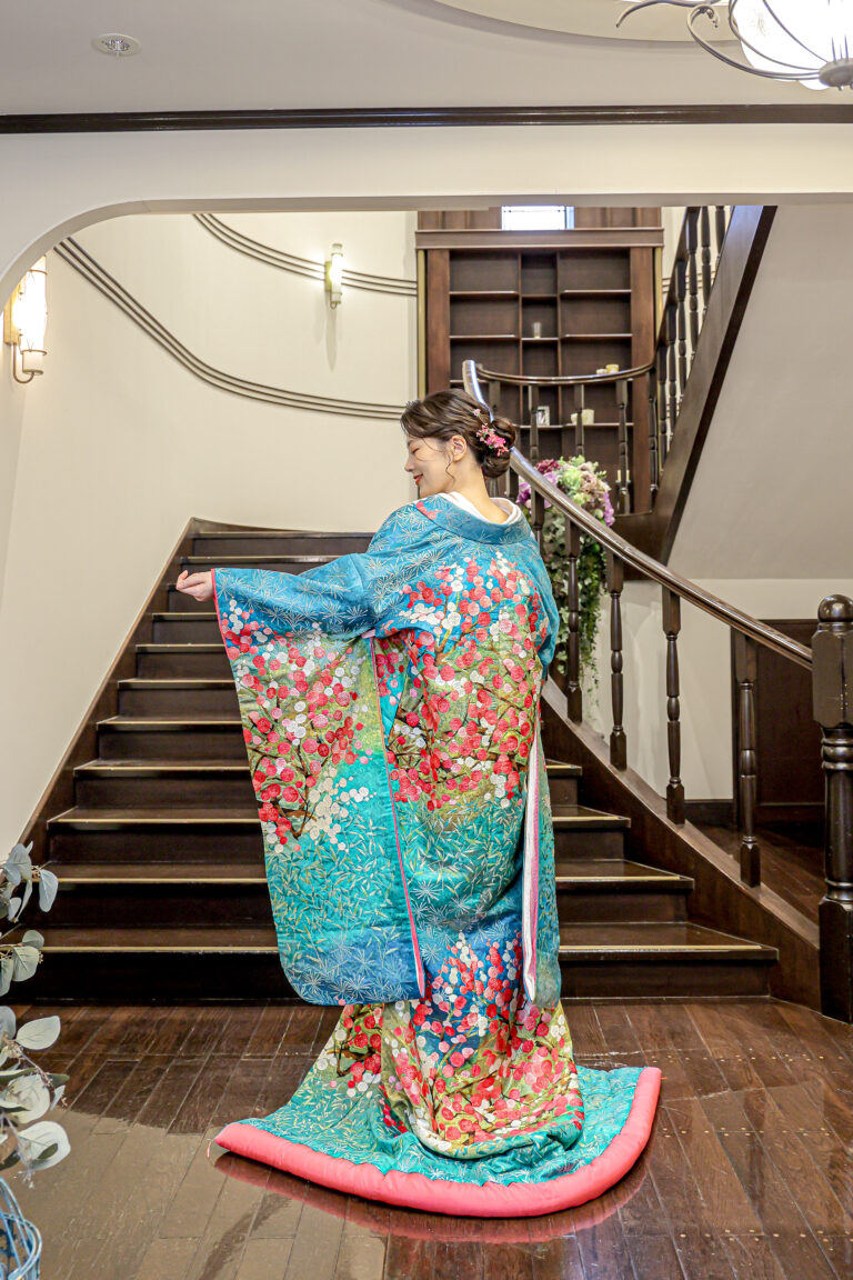 ブルーの色打掛に身を包み紅白梅の花々と共に舞う