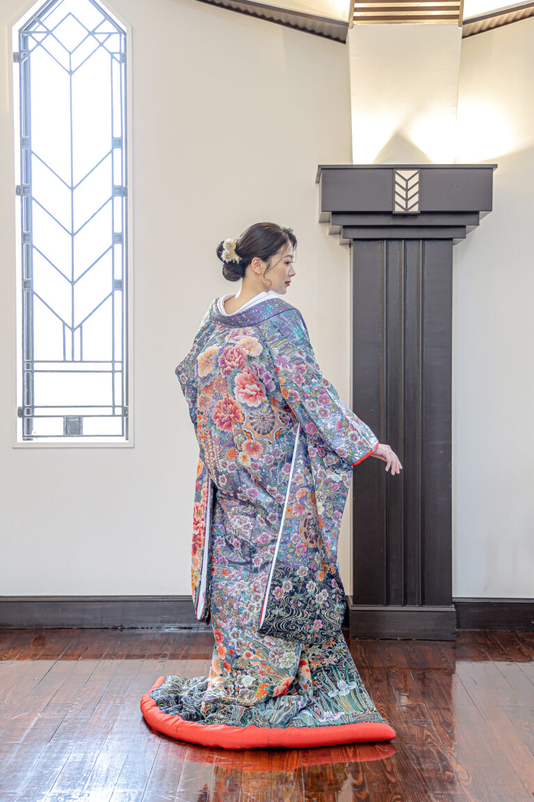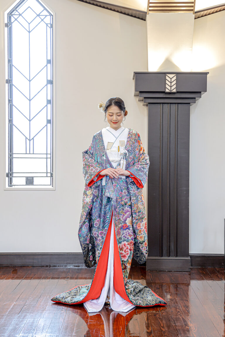 深い青地に咲き誇る四季の花々が、花嫁をより一層華やかに引き立てる色打掛。