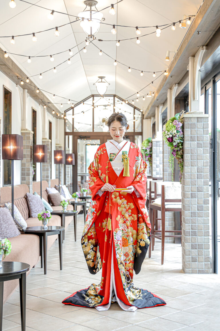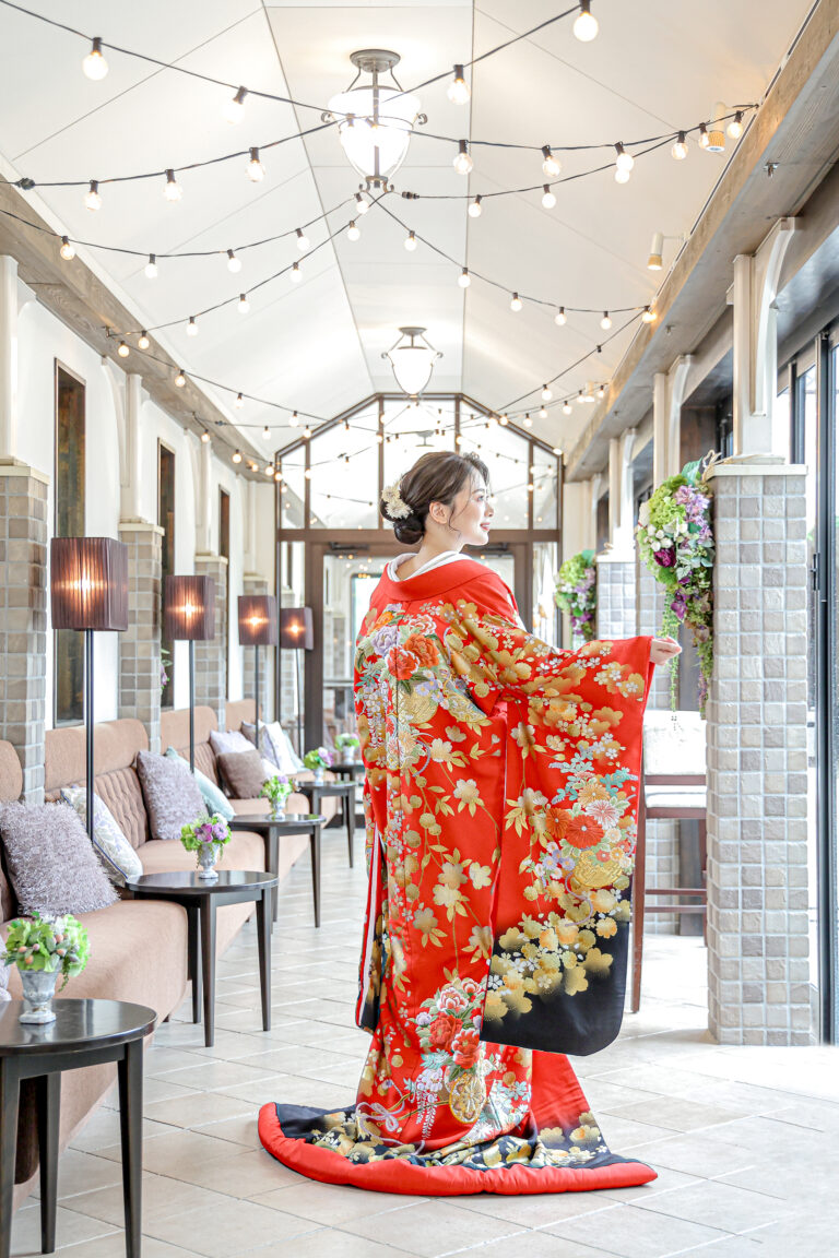 鮮やかな赤の地色も印象的で、上品さ、豪華さ、可愛さが揃った色打掛