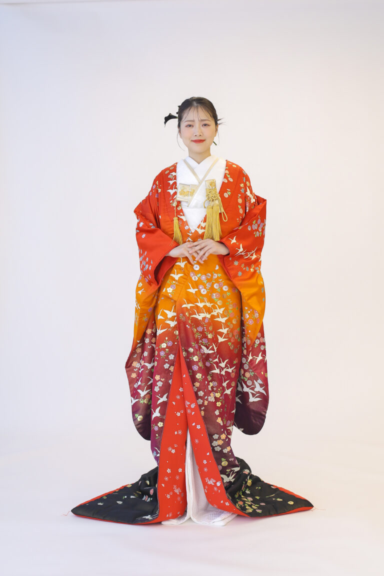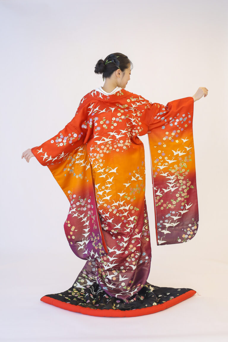 やや朱色がかった明るい赤に白い鶴と赤とオレンジのグラデーションが良く映える色打掛