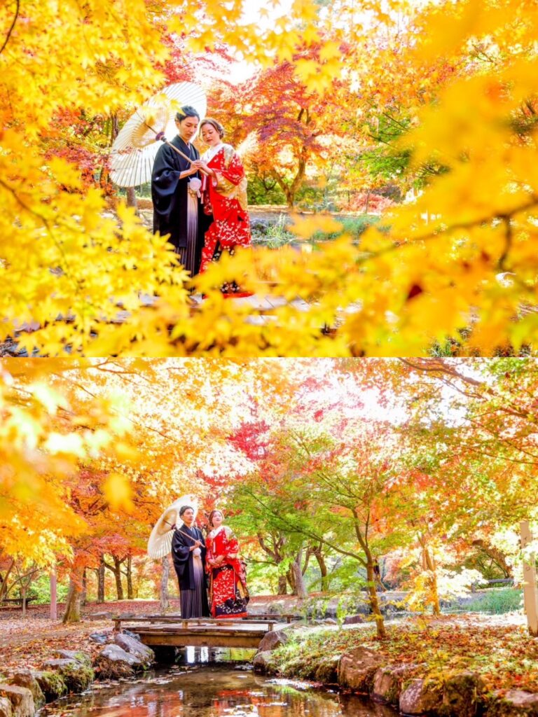 赤と黄色の紅葉に囲まれて和装にぴったりなお写真がお撮りいただけます。