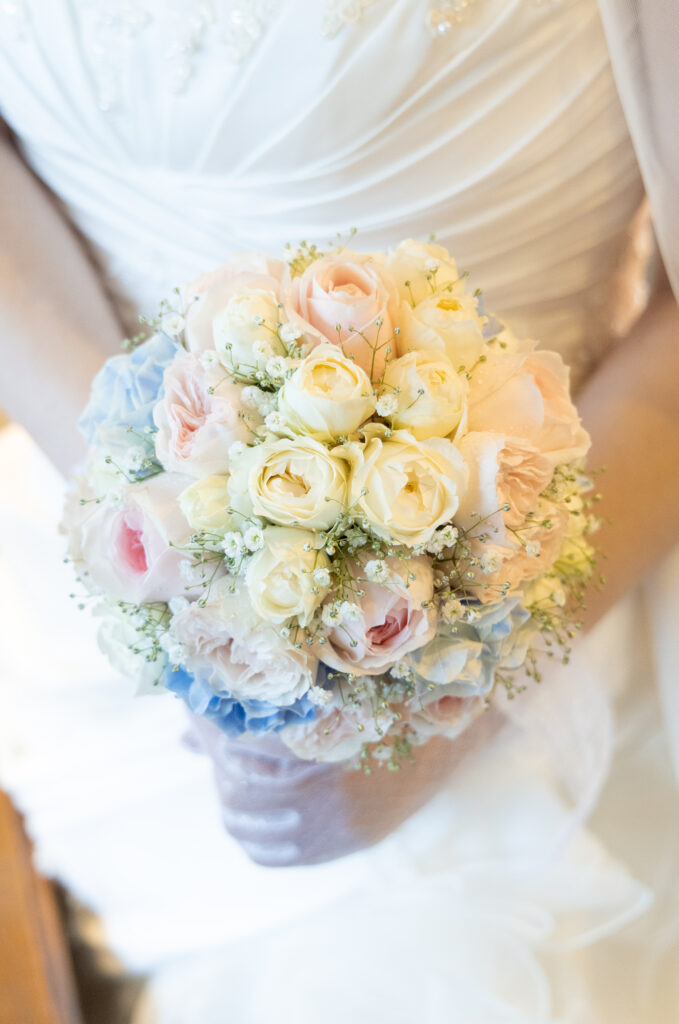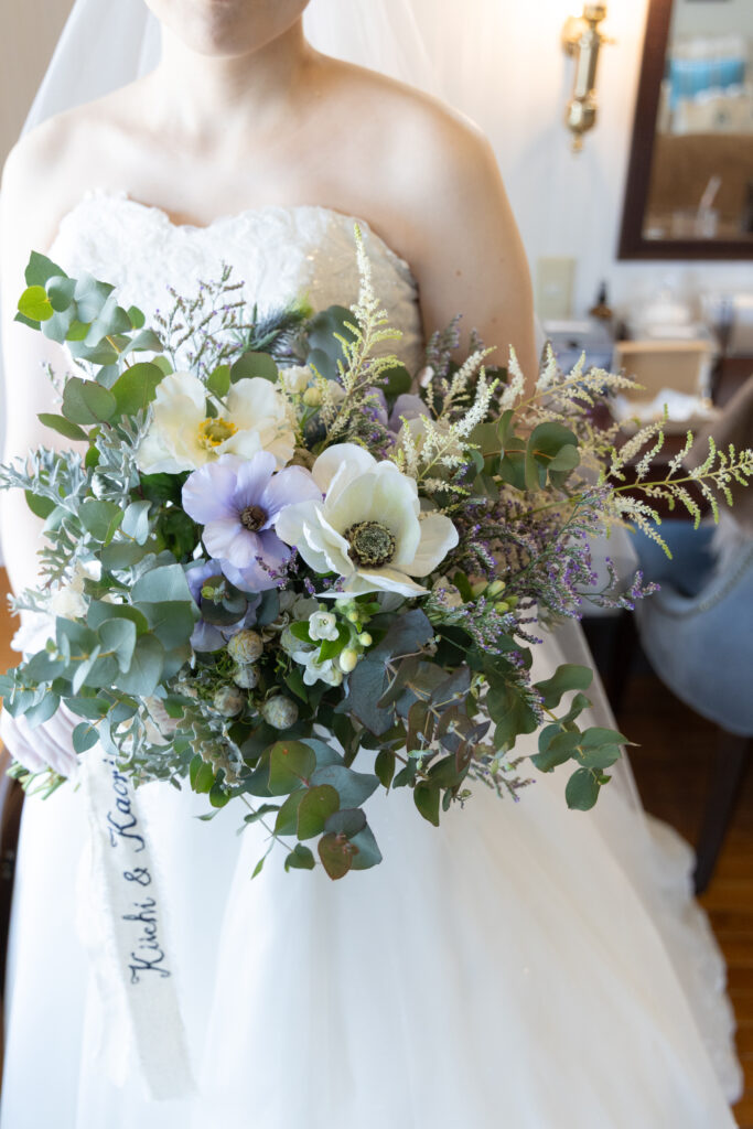 ・ブーケのポイント:白やブルーを混ぜた縦長のデザインで大人かわいい印象に。