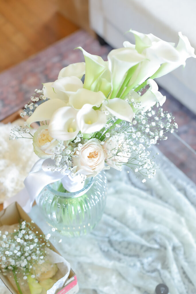 ・ブーケのポイント:白メインに小花を散らして、透明感をアップ。