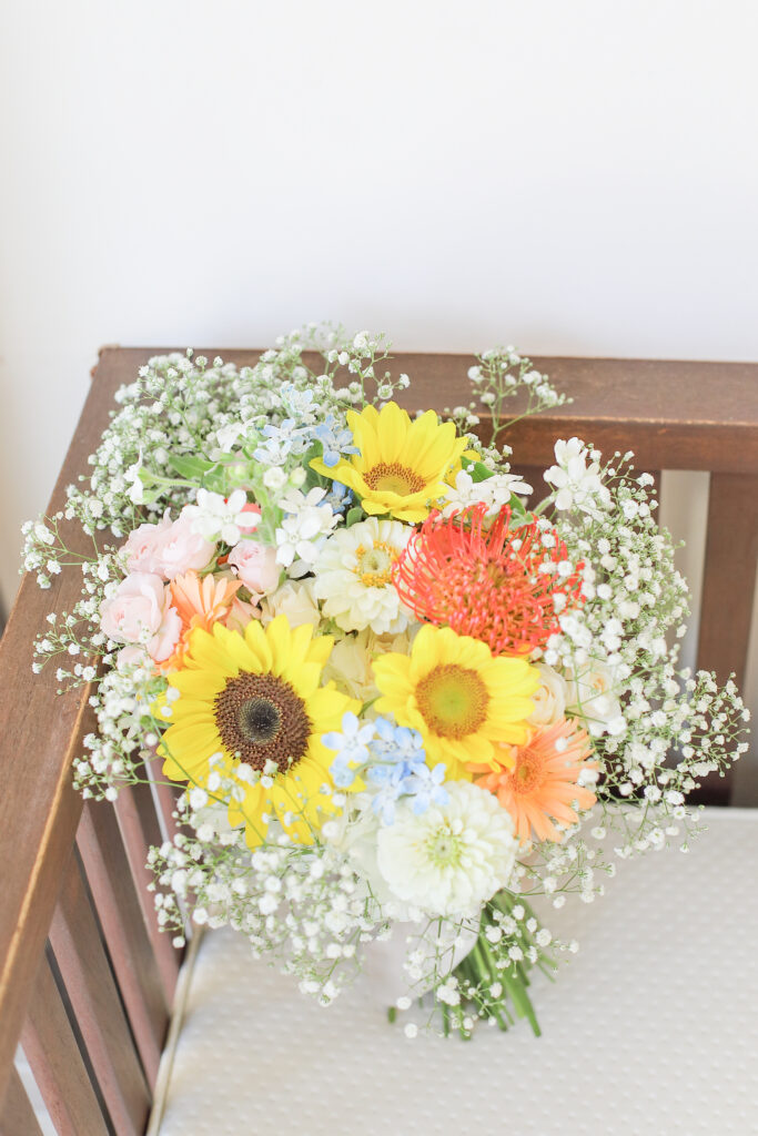 ・ブーケのポイント:元気で明るいひまわりをアクセントに。黄色×グリーンで爽やか。